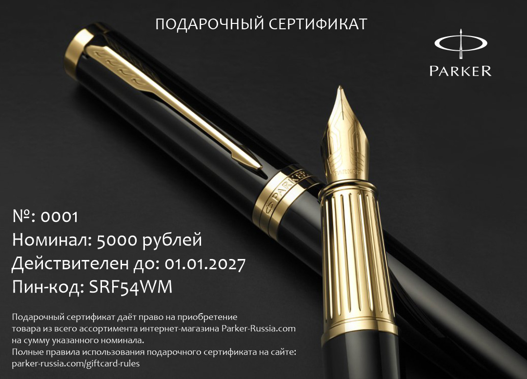 Электронный сертификат гибкого номинала от официального дилера Parker в Ноябрьске. Вы можете дополнительно заказать гравировку, которая подчеркнет Вашу оригинальность и придаст памятность статусному подарку. Все ручки Паркер поставляются в фирменном футляре.